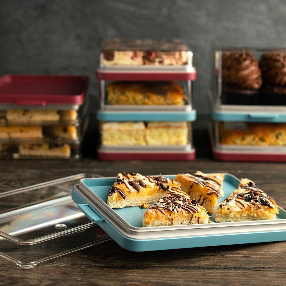 Gerade im Kühlschrank muss Ordnung sein, da Kühlschränke der Erfahrung nach immer zu klein sind. Offene Lebensmittel lagere ich hier nicht, weil sich der Geruch schnell verbreitet und im Kühlschrank festsetzt. Meist sind Lebensmittel, welche verschlossen gelagert werden, auch länger haltbar. In diesen Kühlschrankdosen kannst du Wurst, Käse, Aufschnitt, angebrochene Lebensmittel, Obst und Gemüse lagern und siehst direkt auf einen Blick, was du noch im Kühlschrank hast. Besonders gut eignen sie sich auch als Kuchen- oder Tortenbehälter. Dafür lege ich das Kuchen- oder Tortenstück auf den Deckel der Dose und verschließe die transparente Dose darüber. Die Behälter lassen sich optimal stapeln, so dass im Kühlschrank nichts verrutscht.