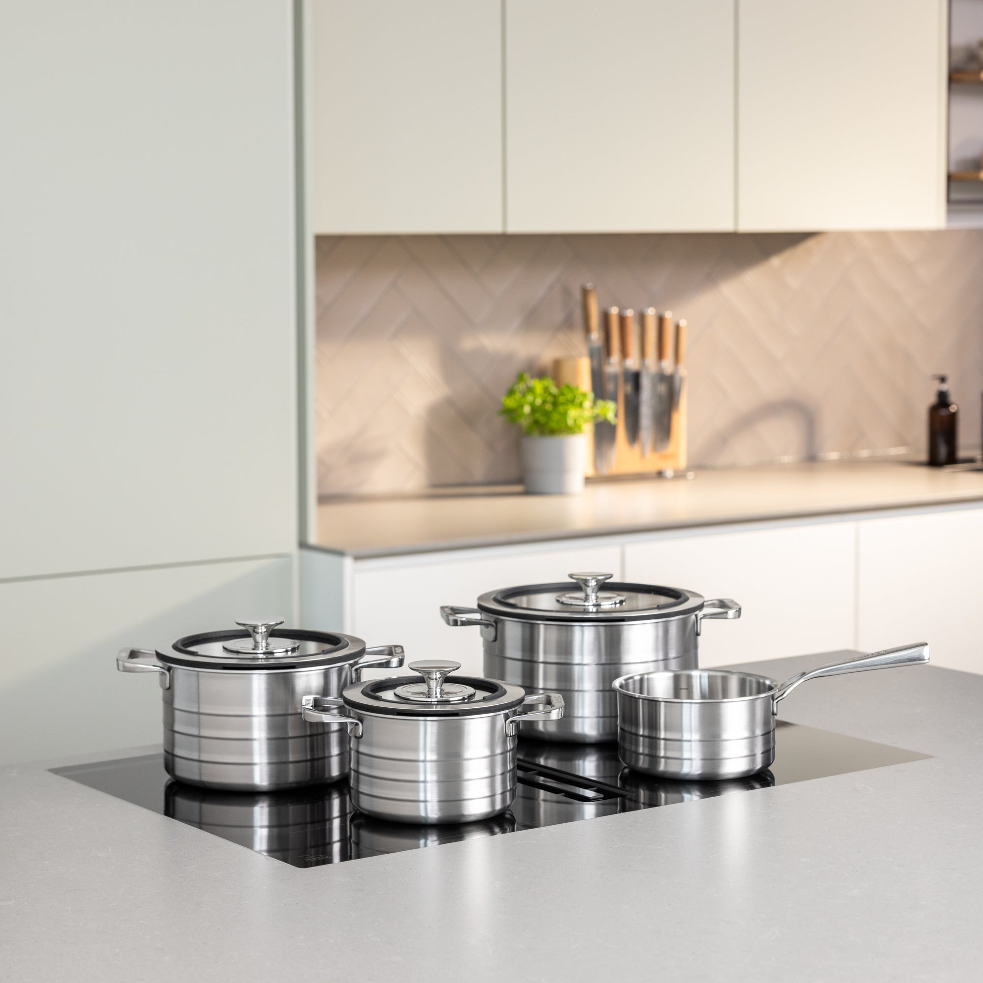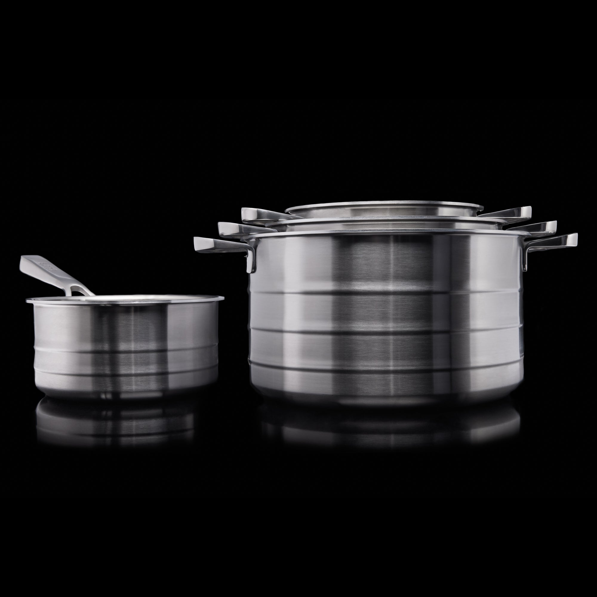 Meine neue Edelstahltopfserie ist qualitativ und optisch ein absoluter Hingucker. Die Töpfe fügen sich perfekt in die Produktwelt ein und bringen aufgrund durchdachter Funktionen Freude beim Kochen. Die neuen „La Cucina“ Edelstahltöpfe sind die perfekte Ergänzung zu meiner Gusseisenserie und geben zusammen ein perfektes Bild auf deinem Herd ab. Du kannst sie im Set oder einzeln erwerben. Die Töpfe sind ineinander stapelbar und haben einen multifunktionalen Deckel. Die Kasserolle hat einen 17 cm langen, hohlen Kalt-Griff.