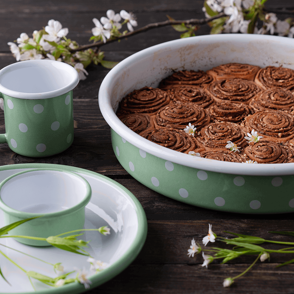 Wusstest du, dass Emaille-Geschirr äußerst ökologisch und nachhaltig ist? Bei der Herstellung werden nur natürliche Rohstoffe verwendet. In einem aufwändigen Verfahren wird die Eisenform des Geschirrs bei 850 °C mit einer Glasschichtüberzogen. Diese Beschichtung sorgt dafür, dass das Geschirr absolut lebensmittelecht, geschmacks-und geruchsneutral ist. Der Metallkern verteilt und speichert die Hitze optimal, so dass du wirklich energieeffizient kochen, braten,backen und nebenbei noch Geld sparen kannst. Außerdem ist Emaille-Geschirr sehr langlebig, strapazierfähig und 100% recyclebar.