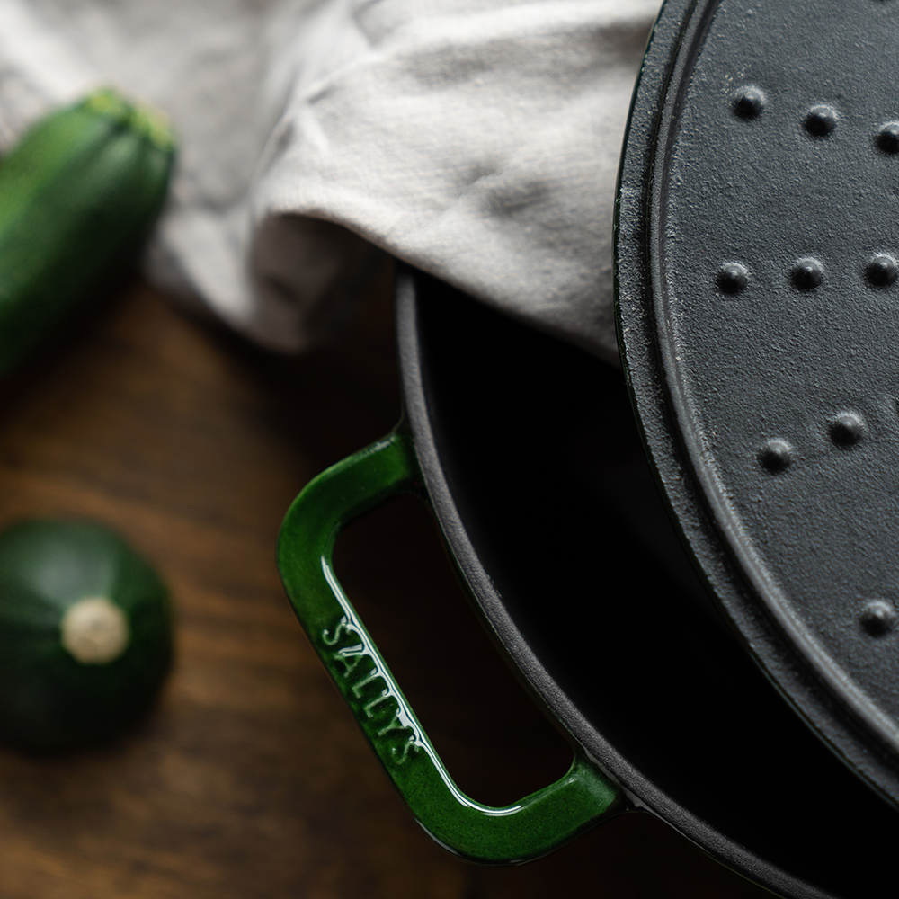 Deshalb ist es auch ausgesprochen gut für Schmorgerichte geeignet - zum langsamen Kochen oder Schmoren bei niedrigen Temperaturen. So bleiben der Geschmack, die Vitamine und auch die Nährstoffe erhalten. Durch die gleichmäßige Wärmeverteilung wird das Gargut auch rundum perfekt und gleichmäßig erhitzt. Gusseisen ist ein natürliches Material und wird mit einer Glasschicht, der Emaille, überzogen. Im Inneren des Topfes befindet sich eine matte Emaillierung, die für perfekte Röstaromen sorgt. Der gusseiserne Topf ist extrem robust, langlebig, vielseitig und einfach per Hand zu reinigen - ein ehrliches Material eben. Ich bereite darin gerne Schmorgerichte, Eintöpfe und Brot zu - aber auch andere Gerichte lassen sich darin hervorragend zubereiten.