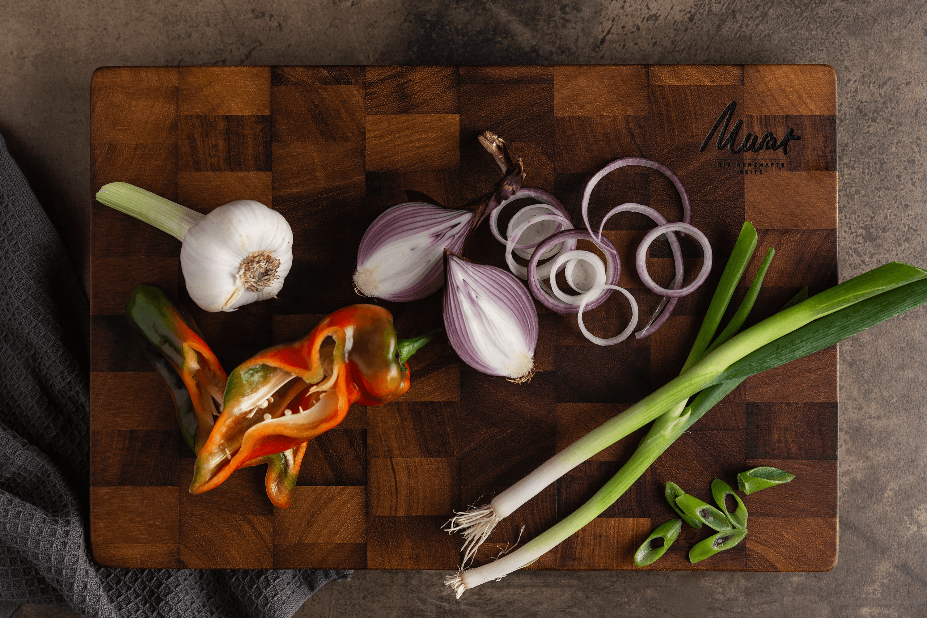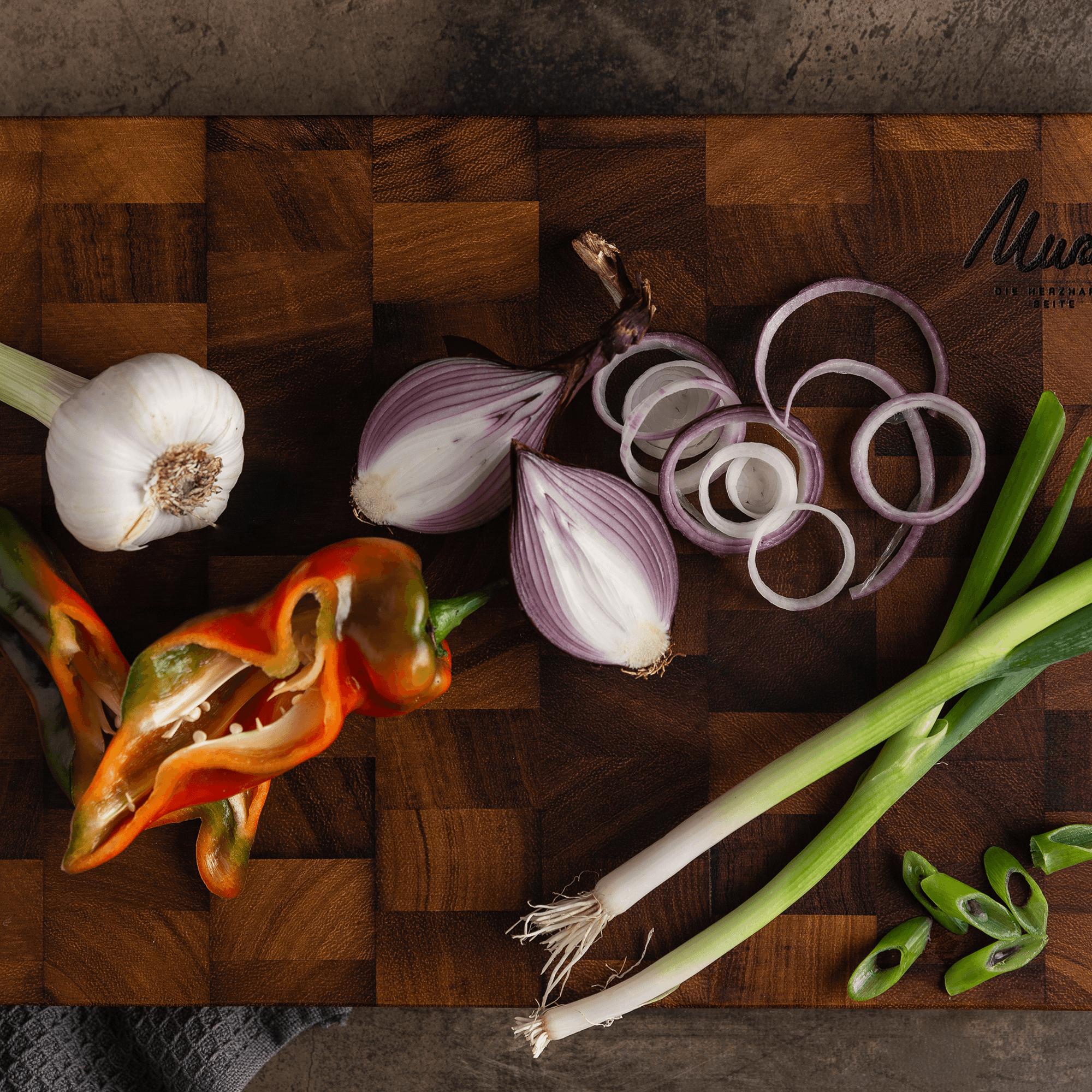 Für dieses Schneidebrett haben wir massives und robustes Eichenholz verwendet. Es ist sehr stabil und langlebig, da es langsam gewachsen ist und dadurch eine hohe Dichte hat. Es ist schwerer und robuster als übliche Holzarten. Durch die markante Maserung ist Eichenholz ein natürliches Highlight und passt sich jeder Küche an. Dank dem hohen Anteil an natürlicher Gerbsäure im Holz, besitzt es wie Olivenholz eine natürliche antibakterielle Eigenschaft. Bei guter Pflege ist es sehr langlebig und schont deine hochwertigen Messer. Ich achte sehr auf die Qualität und Langlebigkeit meiner Produkte. Damit ihr eine Vorstellung von Hölzern, deren Qualität und deren Kostenpunkt habt, möchte ich euch die gängigsten Schneidebrett-Hölzer vorstellen: Die günstigste Variante ist Bambus, was im Prinzip auch kein Holz, sondern ein Gras ist, dicht gefolgt von Buchenholz. Eichenholz liegt im guten Durchschnittsbereich. Wenn du dieses Brett wie einen guten Freund pflegst, ist es vielleicht der Wegbegleiter für dein Leben.