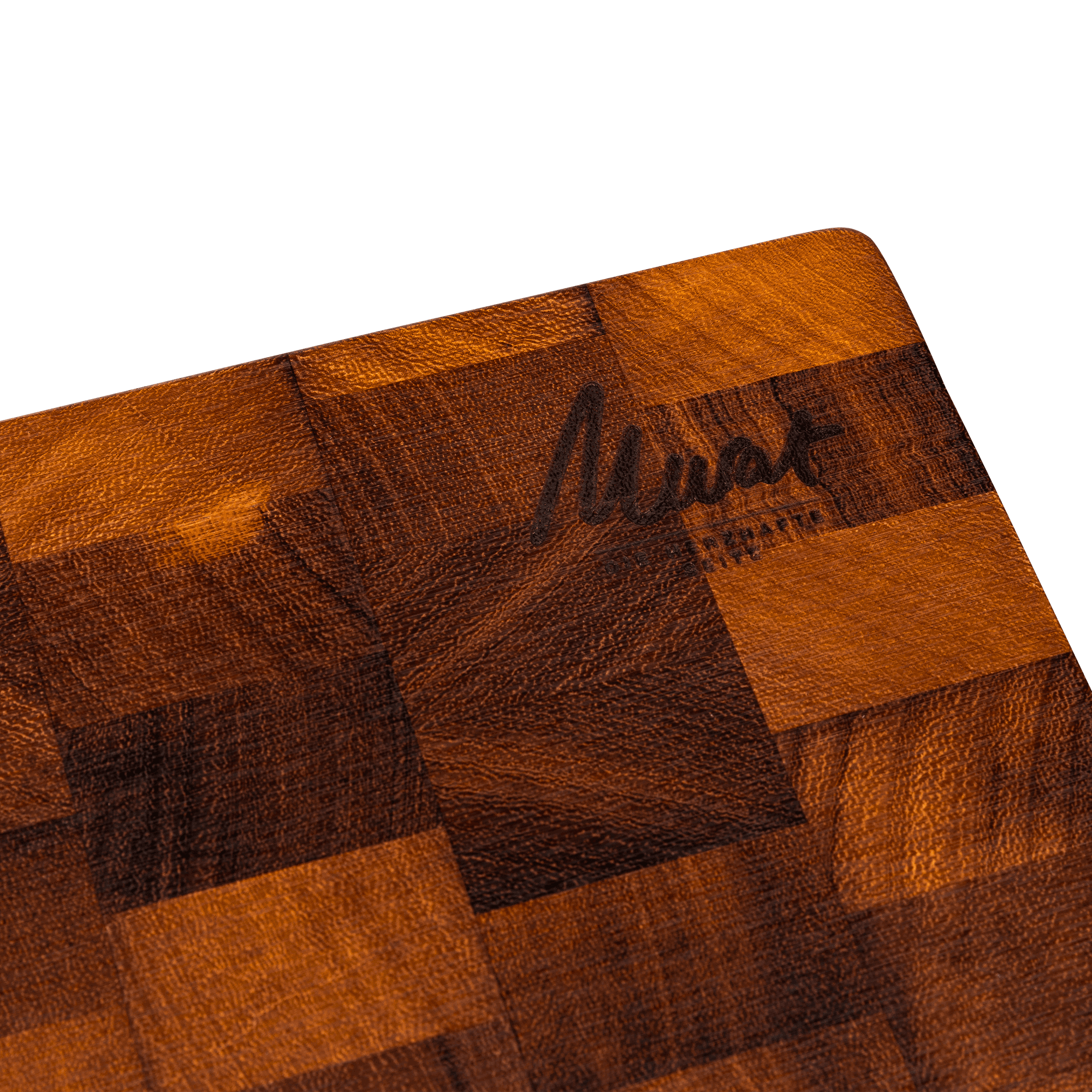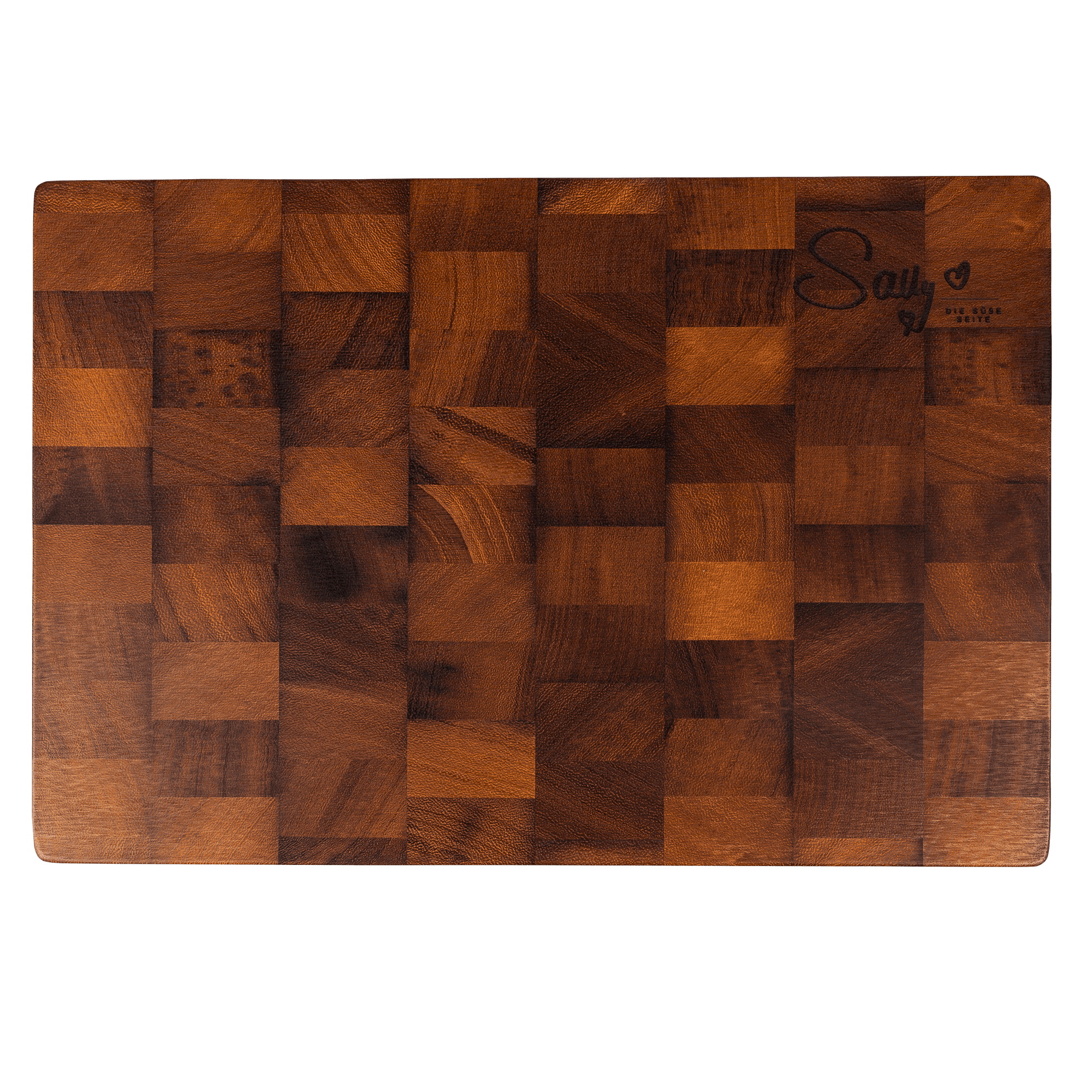 Die perfekte Grundlage zum Zerkleinern, Schneiden und Hacken. Massiver 4 kg Hart-block aus afrikanischem Premium Kambala-holz, geölt, blockverleimt aus Stirnholz, mit Griffen aus Büffelleder. Stirnholz ist die Querschnittsfläche, welche entsteht, wenn man einen Holzstamm quer zersägt. Dadurch verzieht sich das Schneidebrett auch bei Feuchtigkeit nicht und die antibakterielle Wirkung des Holzes wird unterstützt. Das Hartblock Schneidebrett besitzt Anti-Rutsch Gummifüße und schont die Klingen deiner hochwertigen Küchenmesser.