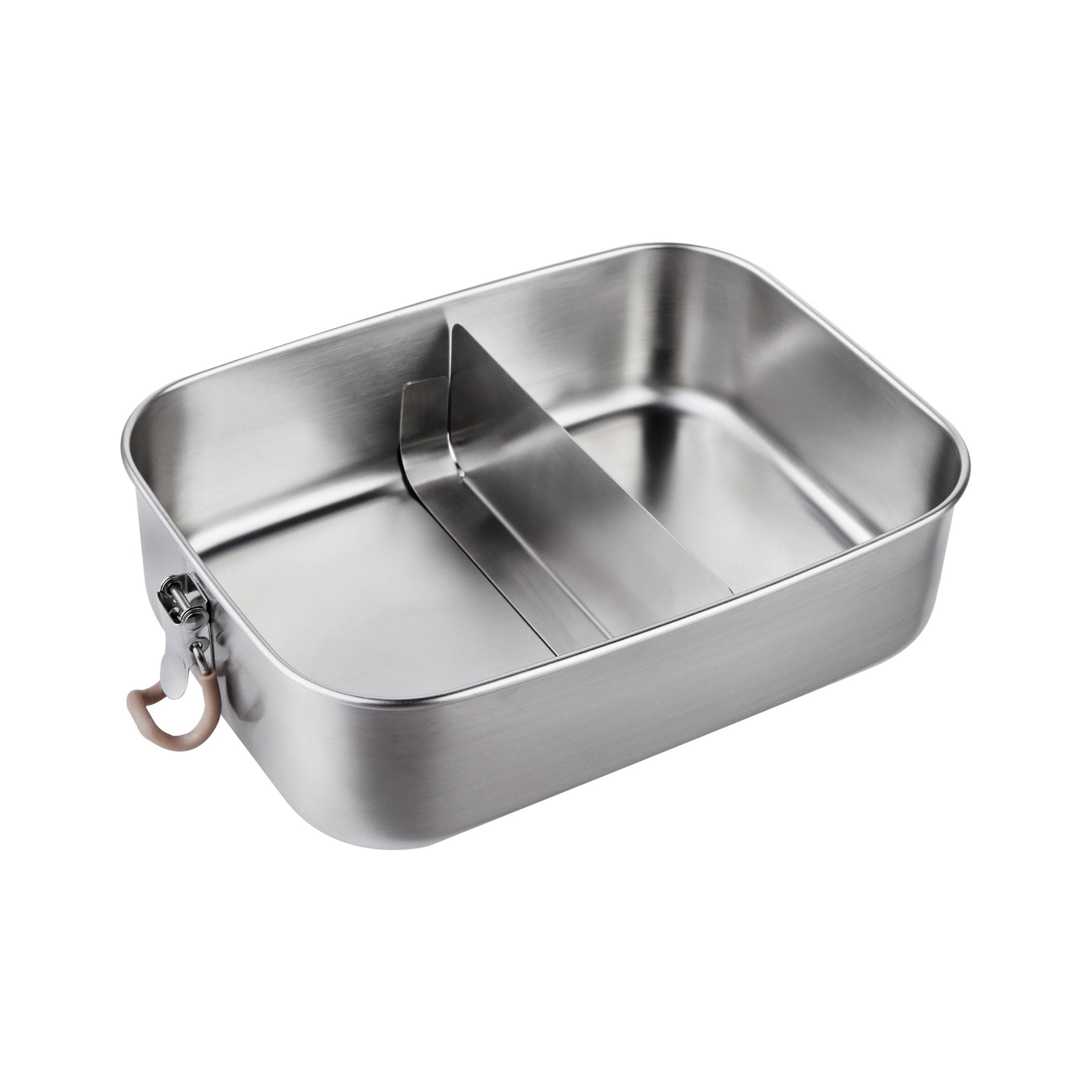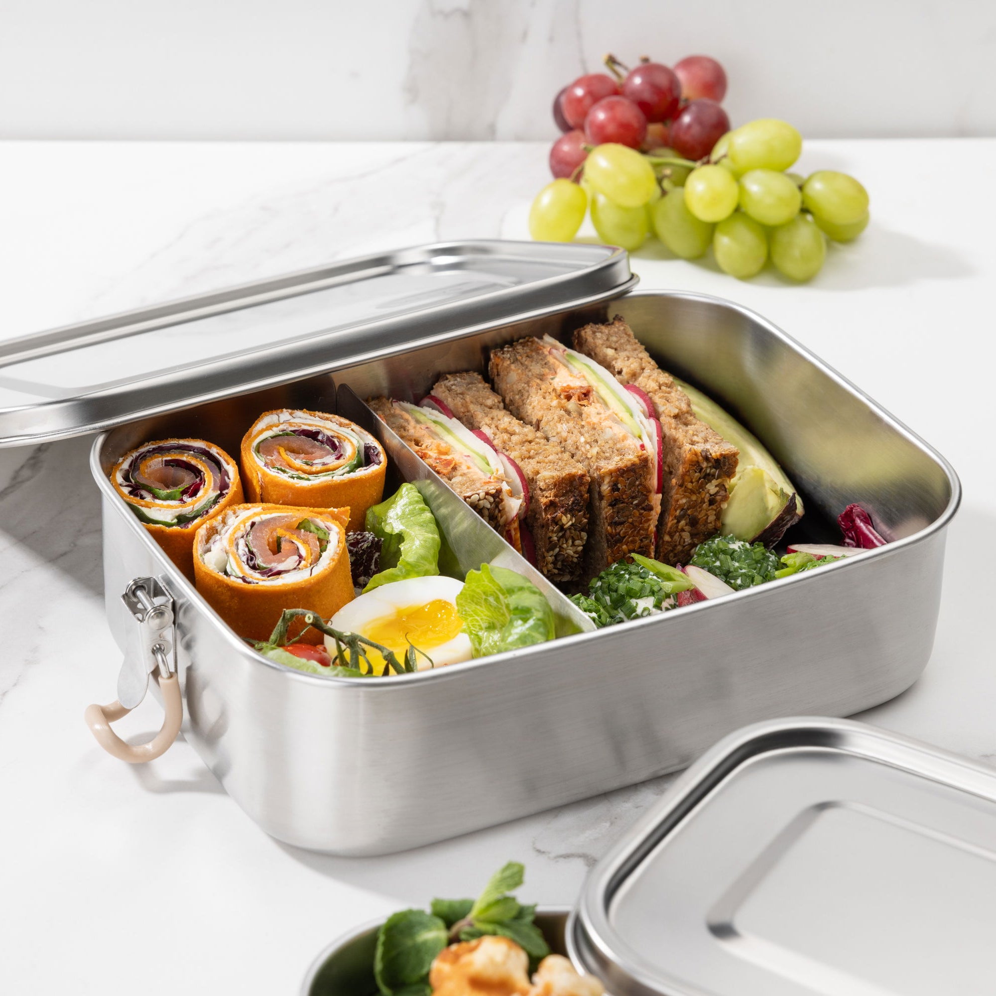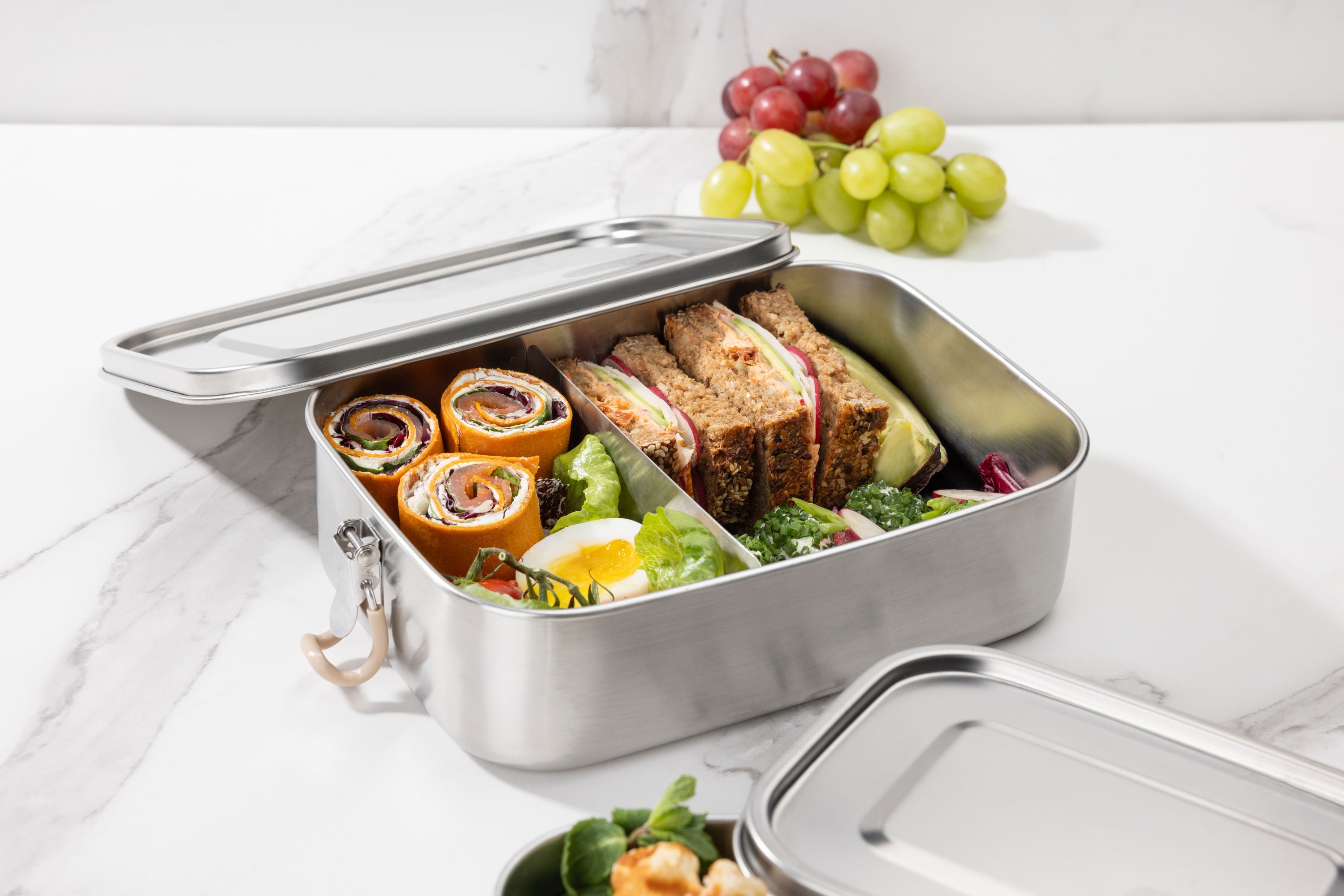 Mit meinen Lunchboxen aus hochwertigem Edelstahl hast du den perfekten Begleiter für die Schule, Arbeit, ein Picknick oder unterwegs. Durch die Dichtung aus Platin-Silikon ist die Dose auslaufsicher, die seitlichen Clips mit Silikonmantel halten die Box zusätzlich dicht zu, so kannst du sie bedenkenlos in deiner Tasche transportieren. Der Separator aus Edelstahl ist verschiebbar und kann so der Größe deiner Speisen angepasst werden und hält gleichzeitig verschiedene Komponenten getrennt. So kannst du auch süßes und salziges oder feuchte und trockene Lebensmittel gleichzeitig verpacken. Da die gesamte Dose aus Edelstahl und Platin-Silikon besteht ist sie sehr robust, stoßfest und kann in der Spülmaschine gereinigt werden. So ist sie besonders langlebig und nachhaltig. Sie ist frei von schädlichem BPA und für Lebensmittel unbedenklich.