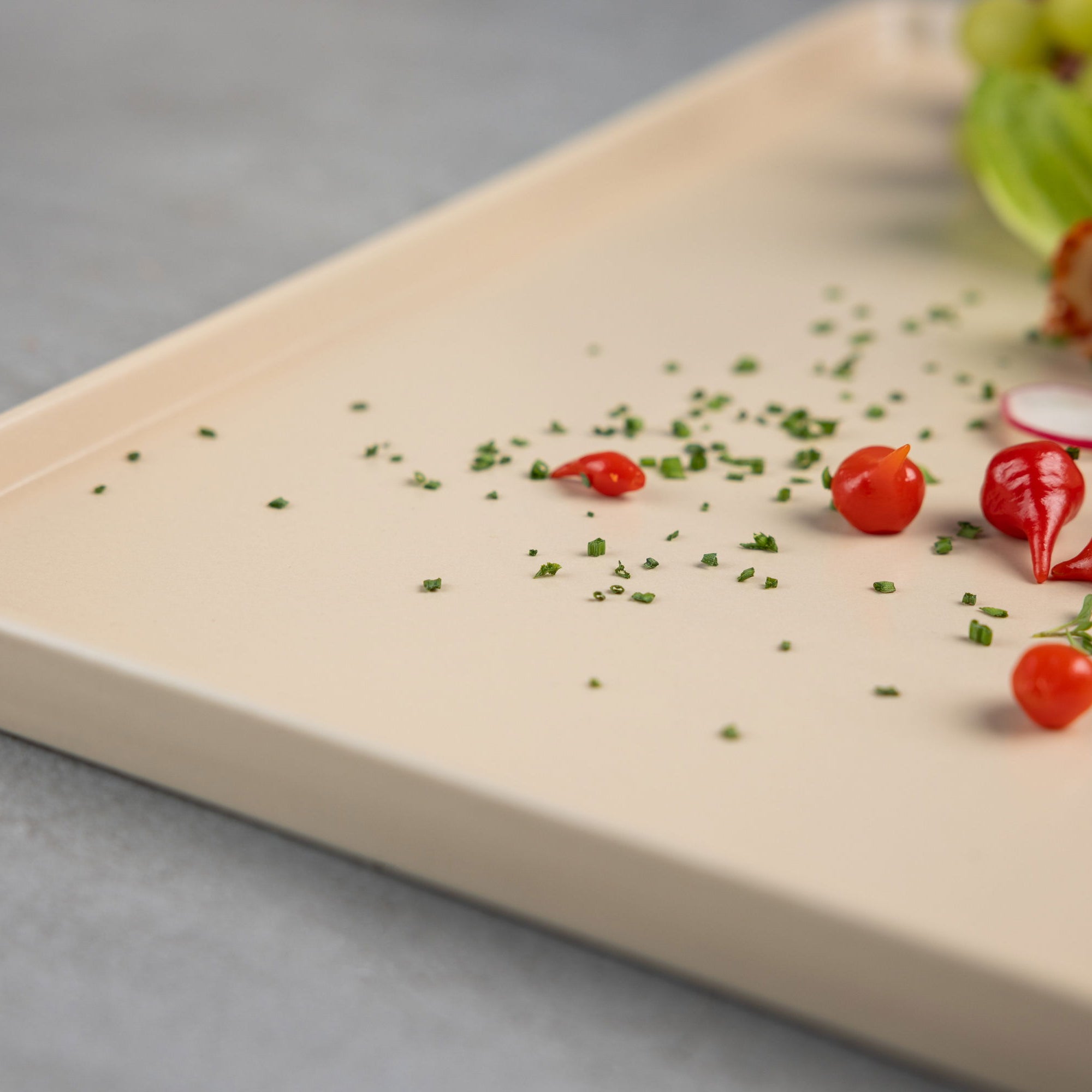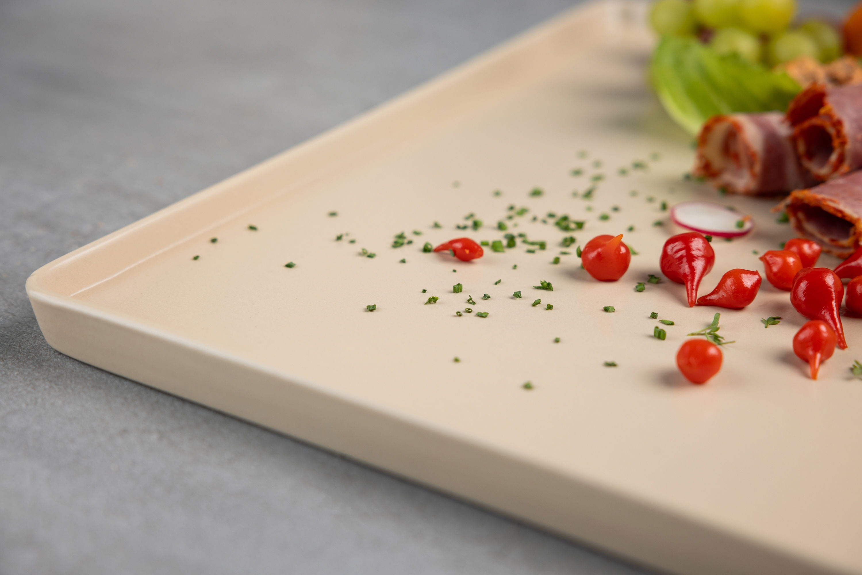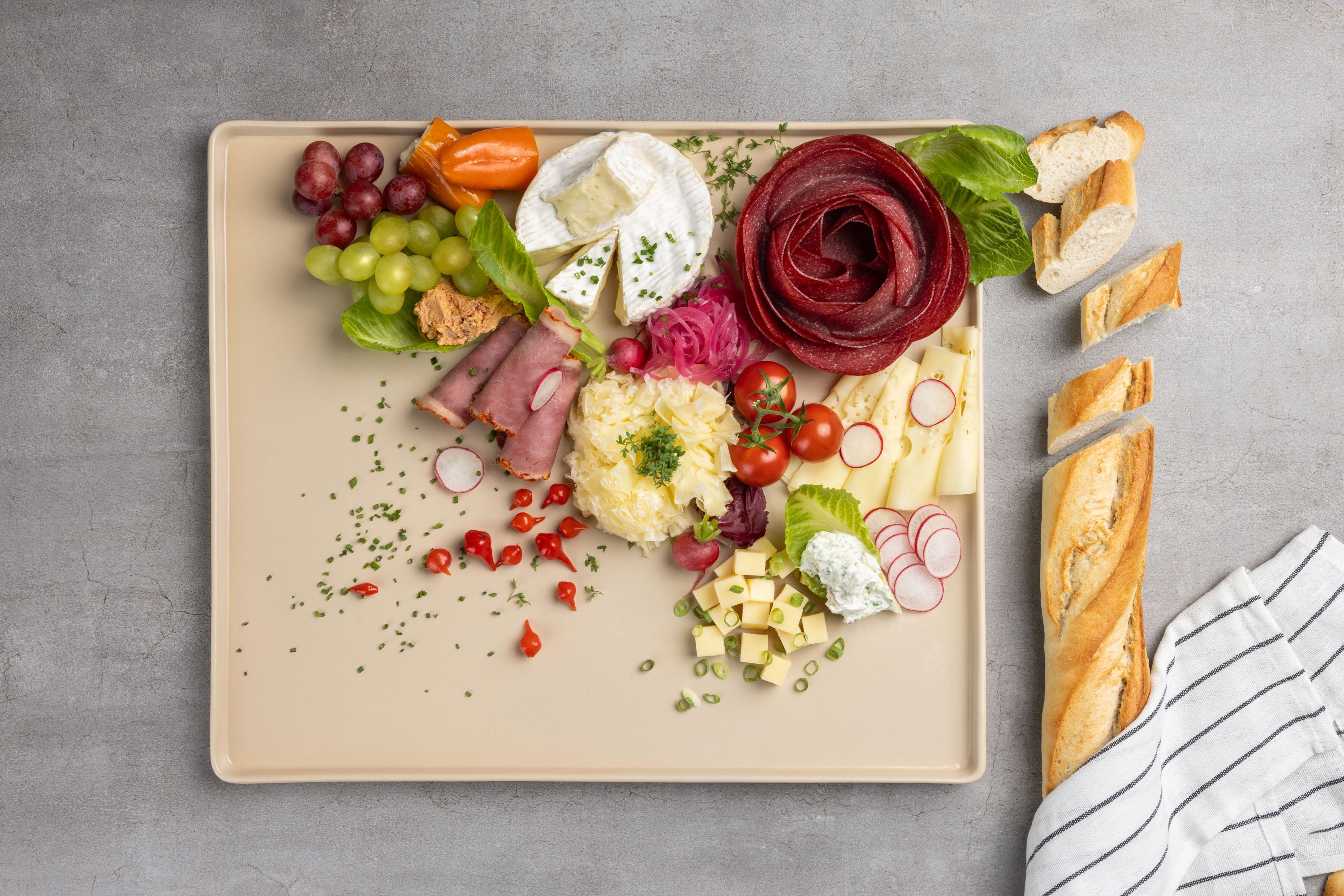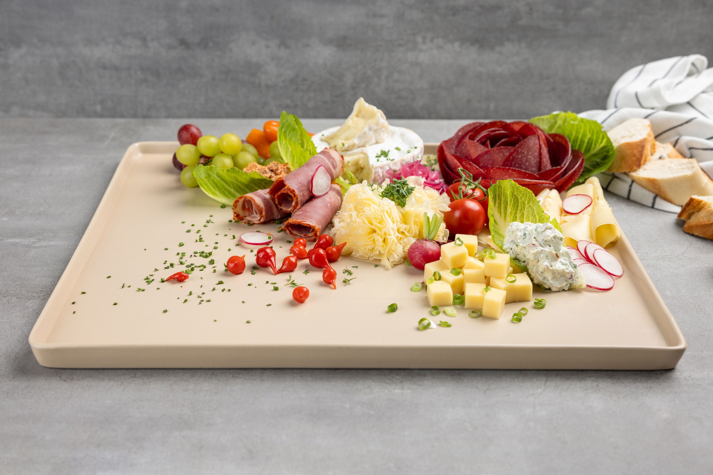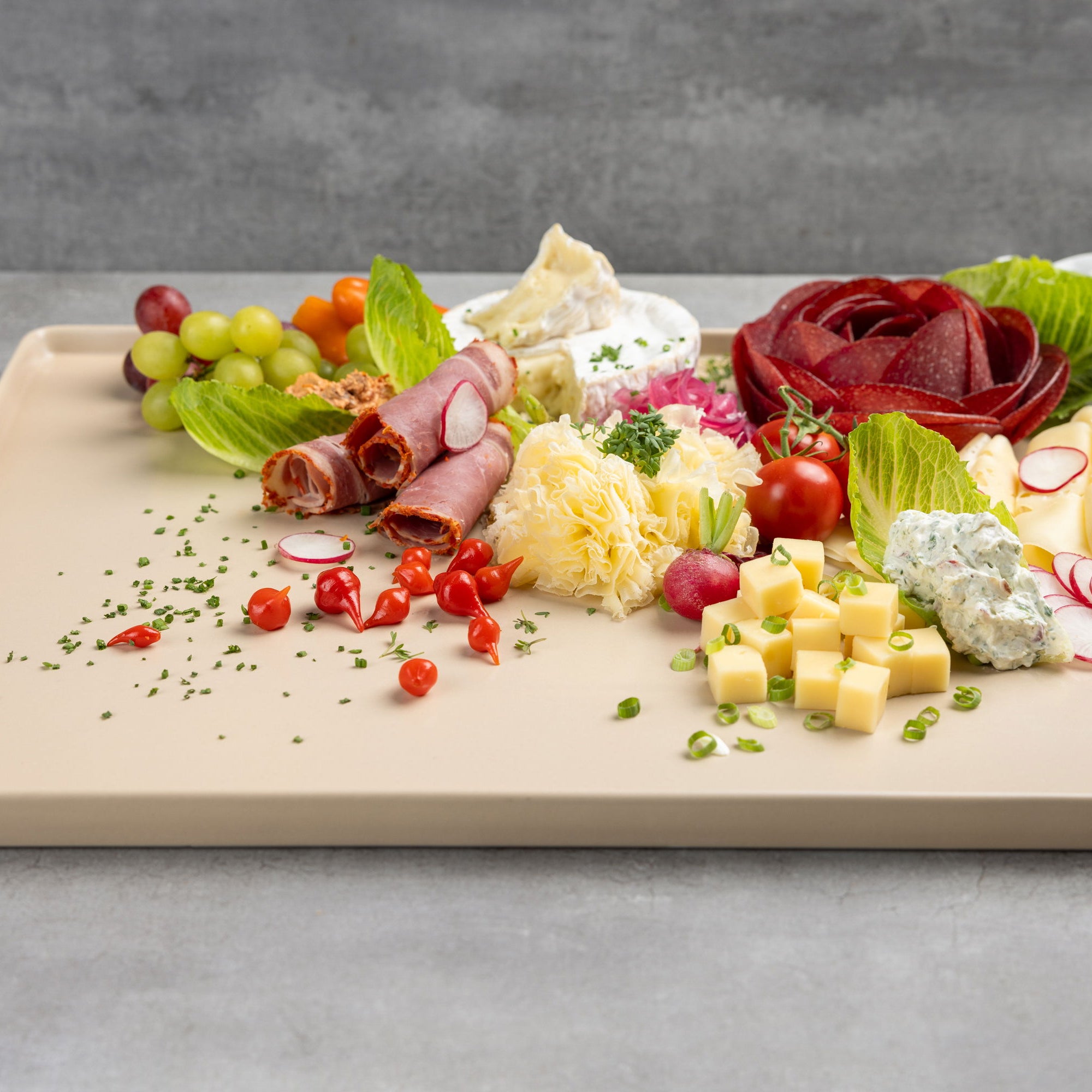 Alle meine Servierplatten gibt es in den Farben Grau, Schwarz, Weiß und Beige, sodass du sie wunderbar mit jeder Tischdekoration kombinieren kannst. So werden deine Gäste begeistert sein. Nur wäre es viel zu schade, diese tolle Servierplatte nur zu besonderen Anlässen aus dem Schrank zu holen. Ich nutze sie fast jeden Tag und liebe sie. Und sie sieht nicht nur großartig aus – mit der dezenten Kante rutscht auch nichts runter und nichts läuft aus.