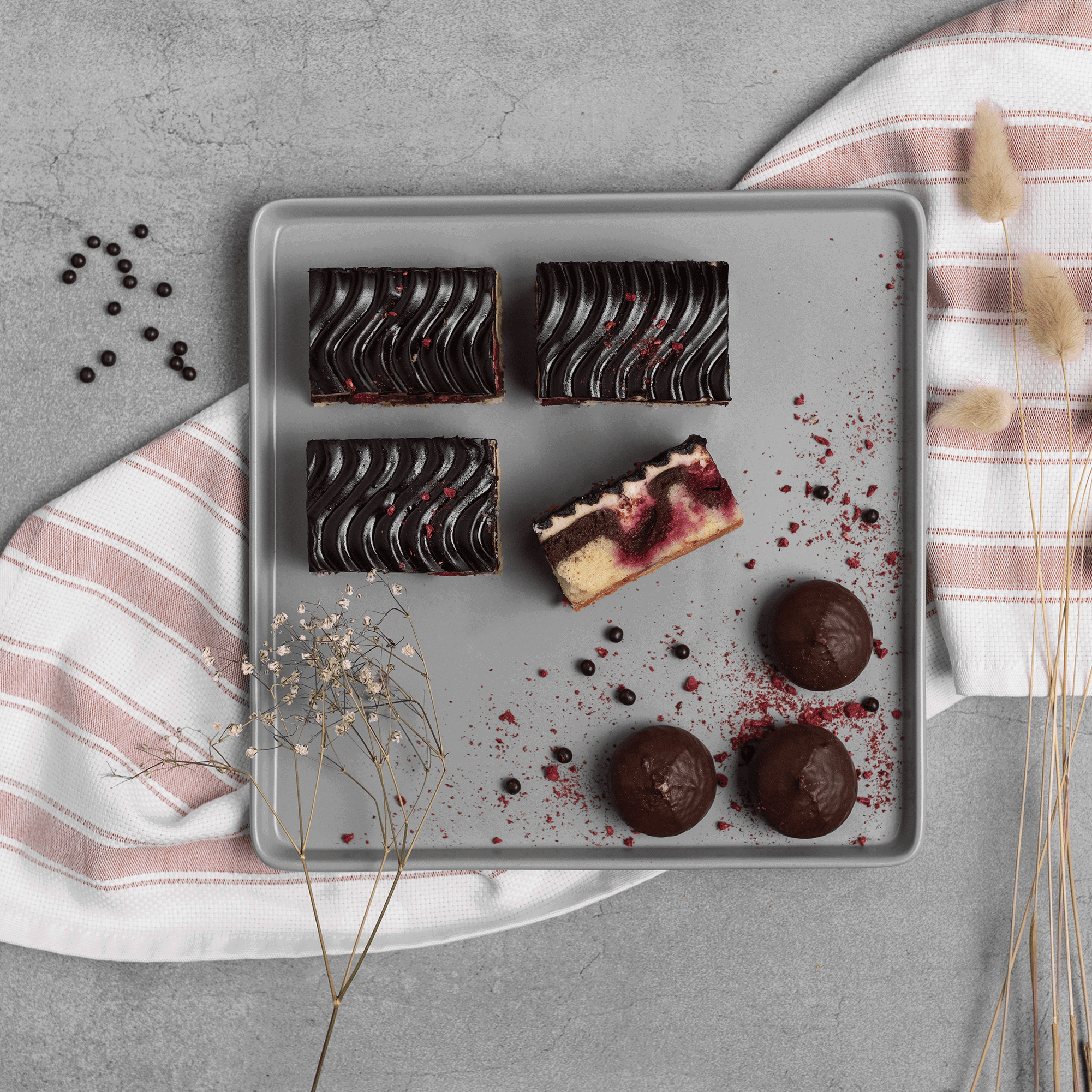 - ideal für: Brownies, kalte und warme Platten in kleineren Mengen, Kuchen- und Tortenschnitten
