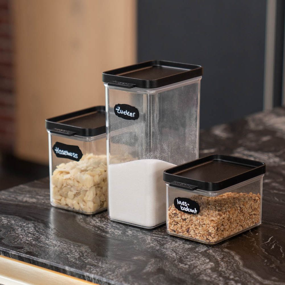 Für aufrechte Küchenschränke und Regale verwende ich am liebsten die Schrank-Vorratsdosen, weil man sie optimal stapeln kann. Die unterschiedlichen Höhen lassen sich wunderbar miteinander kombinieren, so dass ein gleichmäßiges Bild entsteht. Ich selbst habe sie mit abwaschbarer Tafelfolie beklebt und beschrifte sie mit einem Kreidestift - somit kann ich die Vorratsdosen beschriften und beim Inhaltsaustausch dennoch individuell und spontan sein. Auf einen Blick sehe ich, ob ich noch genügend Mehl, Zucker, Stärke, Nüsse etc. im Schrank habe. Der Deckel verschließt zu 100 % dicht, so dass Feuchtigkeit und ungebetenes Ungeziefer nicht ins Innere kommen. Die großen Behälter sind ausreichend für 1 Kilogramm Mehl, Zucker etc.