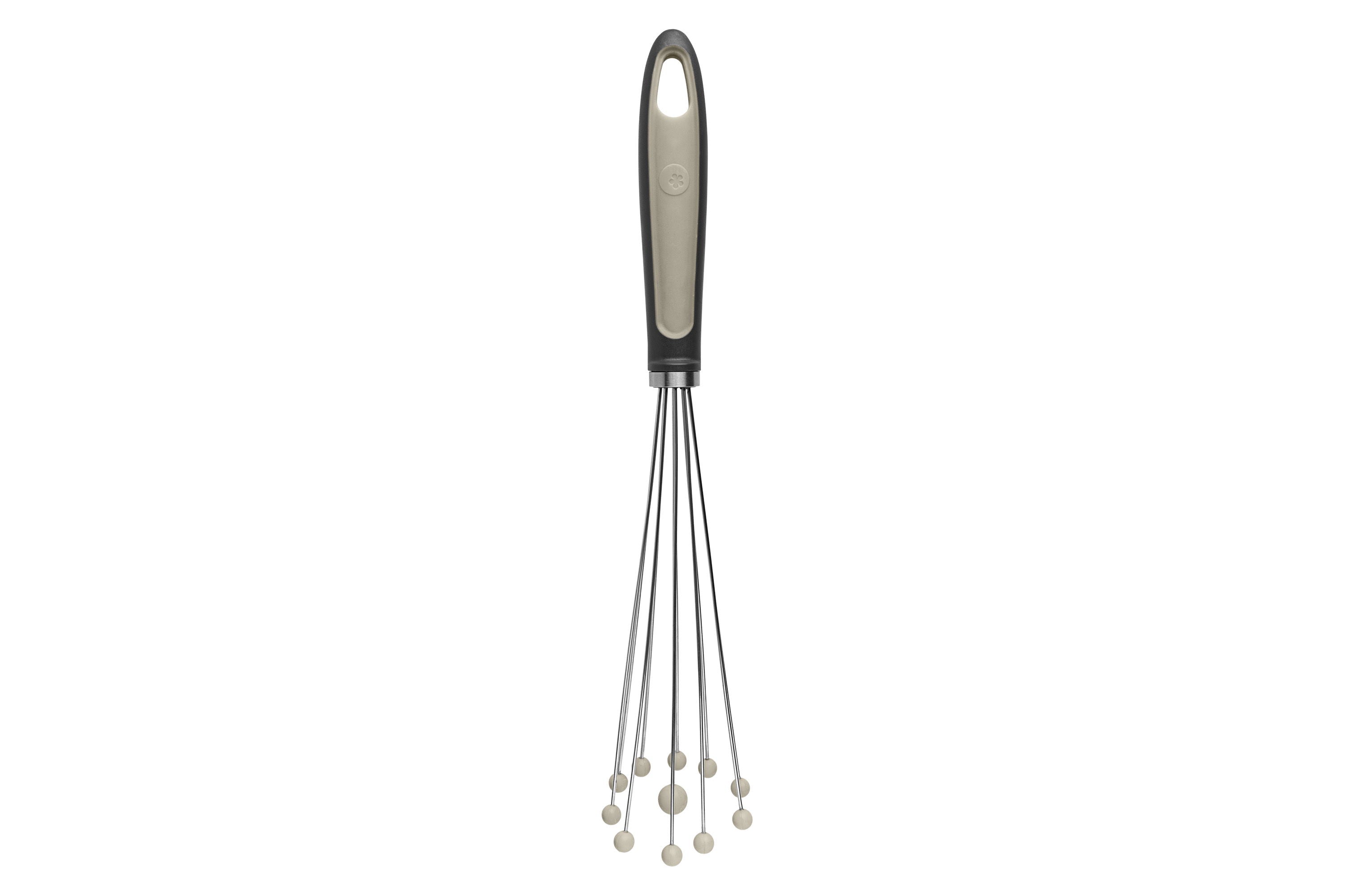 Der Kugelschneebesen ist am besten geeignet für Schalen, Teller oder Pfannen. Deshalb wird er manchmal auch Pfannenbesen genannt. Er ist aufgrund seiner besonderen Form in der Lage auch in flachen Gefäßen alles bestens zu verrühren. Ob Salatsaucen, Sahne, Marinaden oder Eier. Alles lässt sich super gut rühren oder aufschäumen. Durch die Silikonkugeln ist er besonders schonend für deine Pfannen oder Schüsseln.
