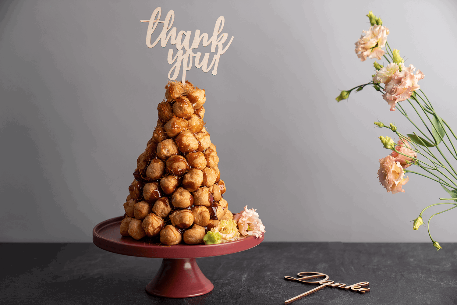 Die Tortendekorationen aus hellem Holz haben eine feine Maserung und bringen einen ländlichen, rustikalen Stil mit sich.