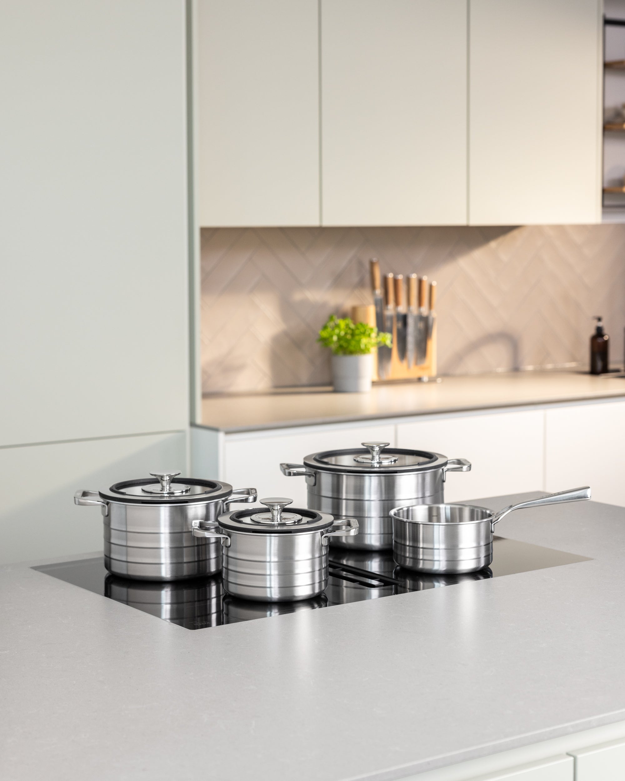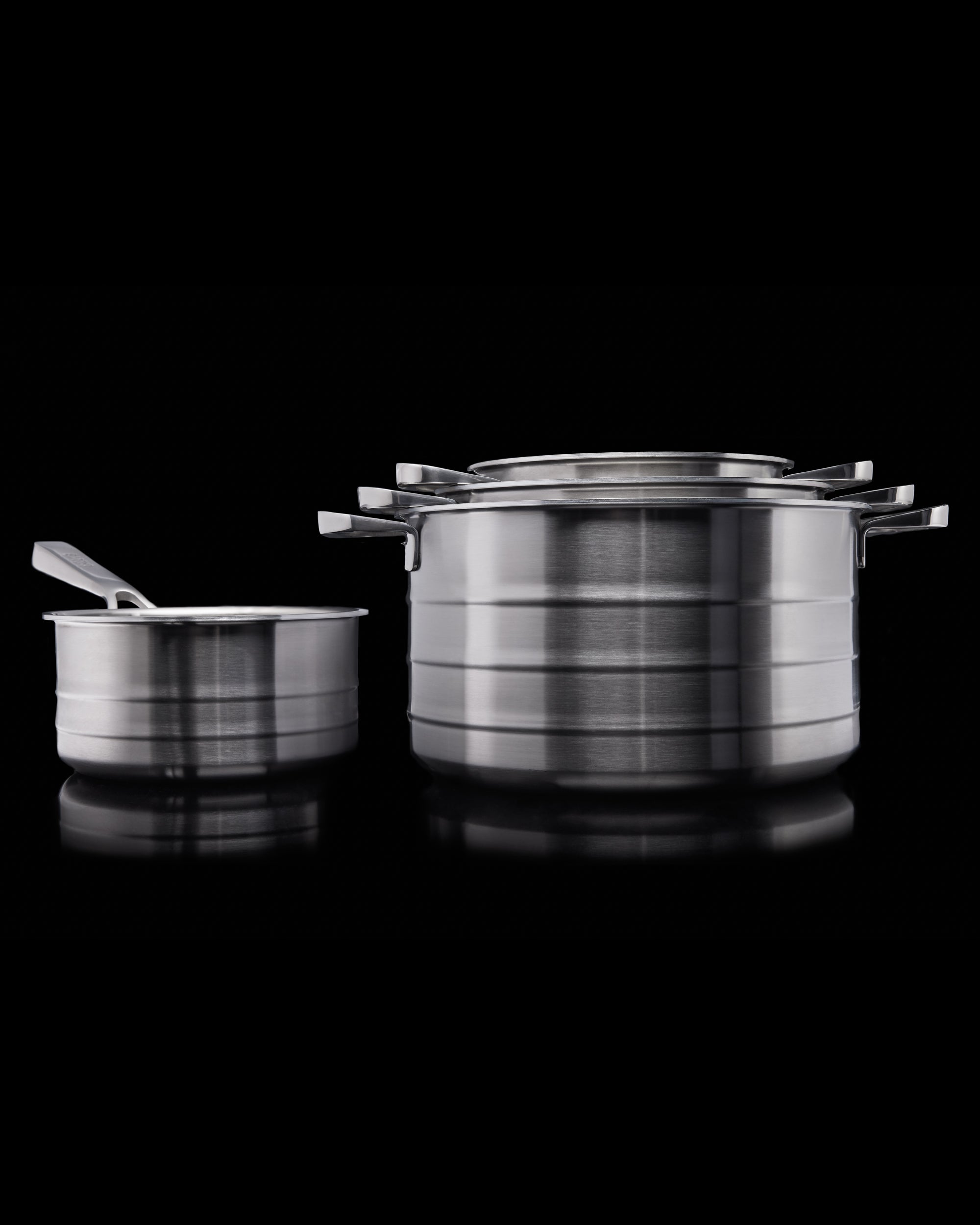 Meine neue Edelstahltopfserie ist qualitativ und optisch ein absoluter Hingucker. Die Töpfe fügen sich perfekt in die Produktwelt ein und bringen aufgrund durchdachter Funktionen Freude beim Kochen. Die neuen „La Cucina“ Edelstahltöpfe sind die perfekte Ergänzung zu meiner Gusseisenserie und geben zusammen ein perfektes Bild auf deinem Herd ab. Du kannst sie im Set oder einzeln erwerben. Die Töpfe sind ineinander stapelbar und haben einen multifunktionalen Deckel. Die Kasserolle hat einen 17 cm langen, hohlen Kalt-Griff.