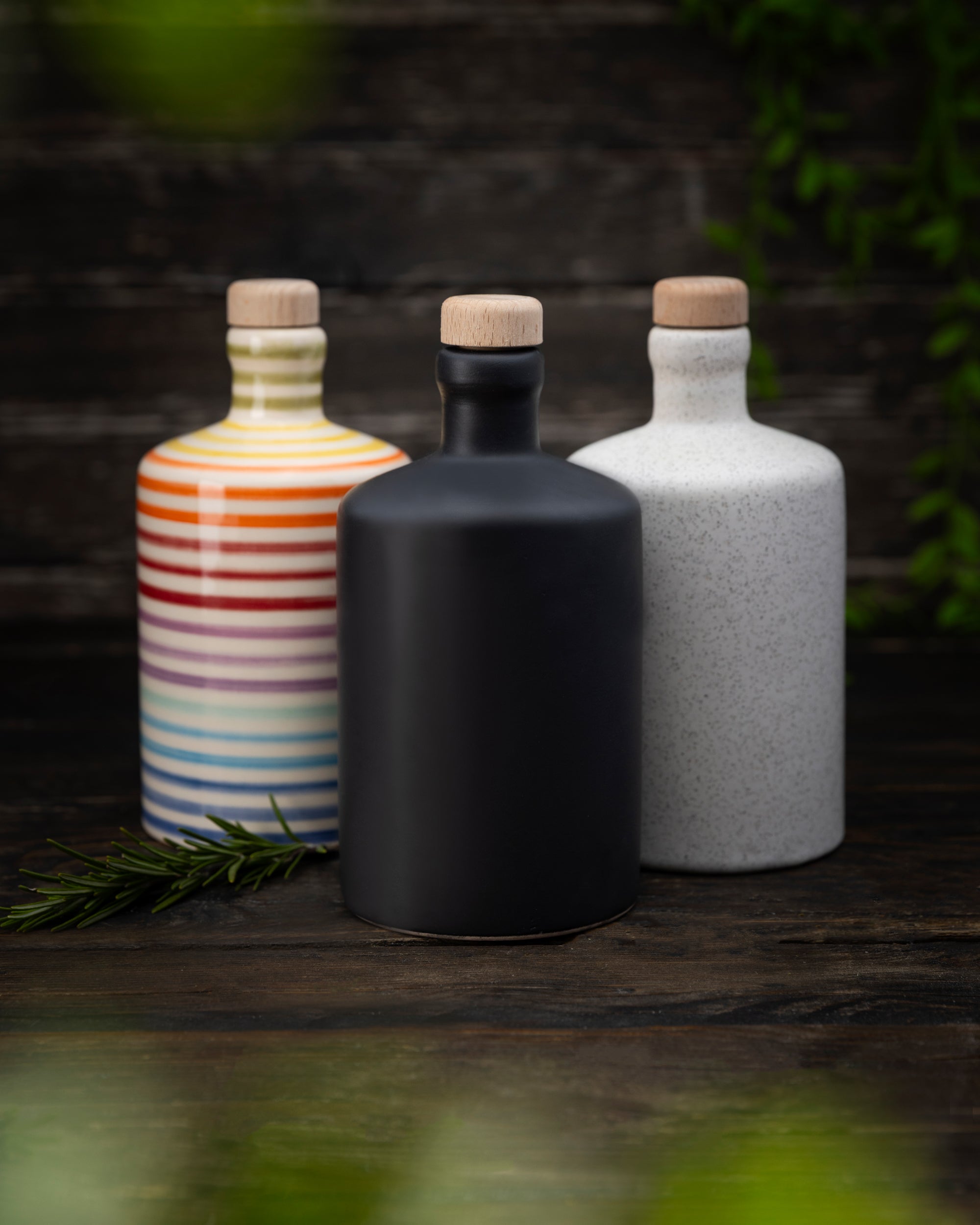Sortenreines Premium-Olivenöl aus Frühernte, kaltgepresst an der türkischen Ägäisküste und abgefüllt in einer handgemachten, handbemalten Keramikflasche.