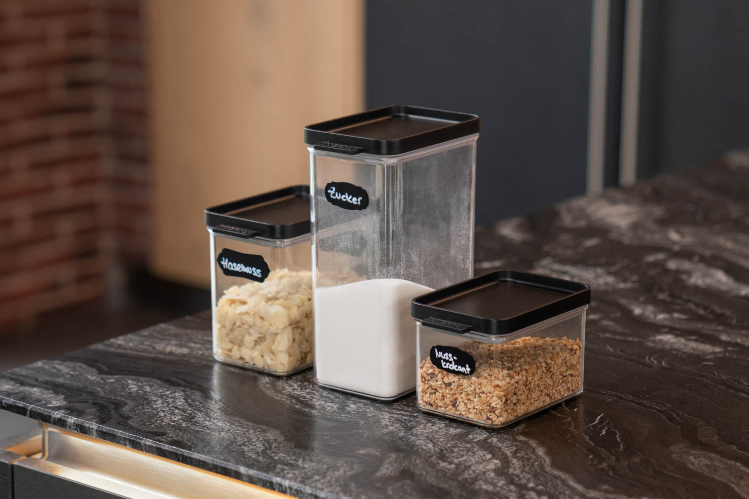 Für aufrechte Küchenschränke und Regale verwende ich am liebsten die Schrank-Vorratsdosen, weil man sie optimal stapeln kann. Die unterschiedlichen Höhen lassen sich wunderbar miteinander kombinieren, so dass ein gleichmäßiges Bild entsteht. Ich selbst habe sie mit abwaschbarer Tafelfolie beklebt und beschrifte sie mit einem Kreidestift - somit kann ich die Vorratsdosen beschriften und beim Inhaltsaustausch dennoch individuell und spontan sein. Auf einen Blick sehe ich, ob ich noch genügend Mehl, Zucker, Stärke, Nüsse etc. im Schrank habe. Der Deckel verschließt zu 100 % dicht, so dass Feuchtigkeit und ungebetenes Ungeziefer nicht ins Innere kommen. Die großen Behälter sind ausreichend für 1 Kilogramm Mehl, Zucker etc.
