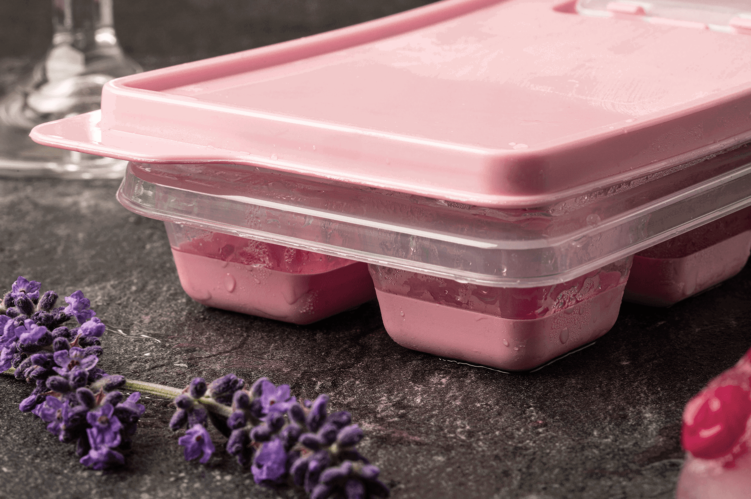 Die Eisformen mit dem verschließbaren Deckel verwende ich nicht nur, um Wasser zu gefrieren, sondern auch für Säfte, Kaffee oder andere Getränke. Darin lassen sich wunderbar Lebensmittel wie Tomaten- oder Paprikamark, Butter, Hefe, Babynahrung, Kräuter oder Brühe portioniert einfrieren oder auch Eiskonfekt und Schokoladenpralinen herstellen. Durch den weichen Silikonboden lassen sich die gefrorenen Lebensmittel einfach herausdrücken.