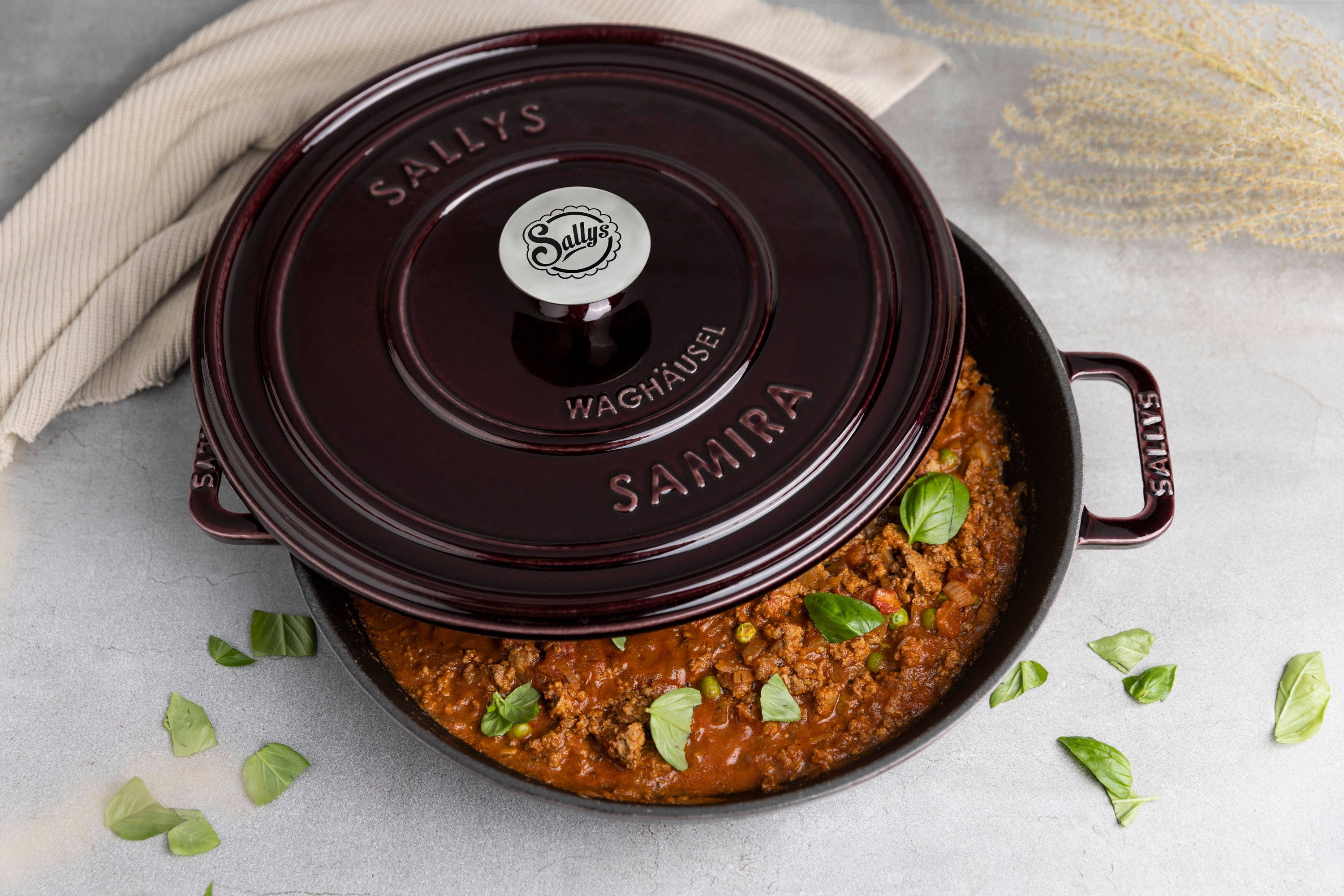 Deshalb ist es auch ausgesprochen gut für Schmorgerichte geeignet - zum langsamen Kochen oder Schmoren bei niedrigen Temperaturen. So bleiben der Geschmack, die Vitamine und auch die Nährstoffe erhalten. Durch die gleichmäßige Wärmeverteilung wird das Gargut auch rundum perfekt und gleichmäßig erhitzt. Gusseisen ist ein natürliches Material und wird mit einer Glasschicht, der Emaille, überzogen. Im Inneren des Topfes befindet sich eine matte Emaillierung, die für perfekte Röstaromen sorgt. Der gusseiserne Topf ist extrem robust, langlebig, vielseitig und einfach per Hand zu reinigen - ein ehrliches Material eben. Ich bereite darin gerne Schmorgerichte, Eintöpfe und Brot zu - aber auch andere Gerichte lassen sich darin hervorragend zubereiten.